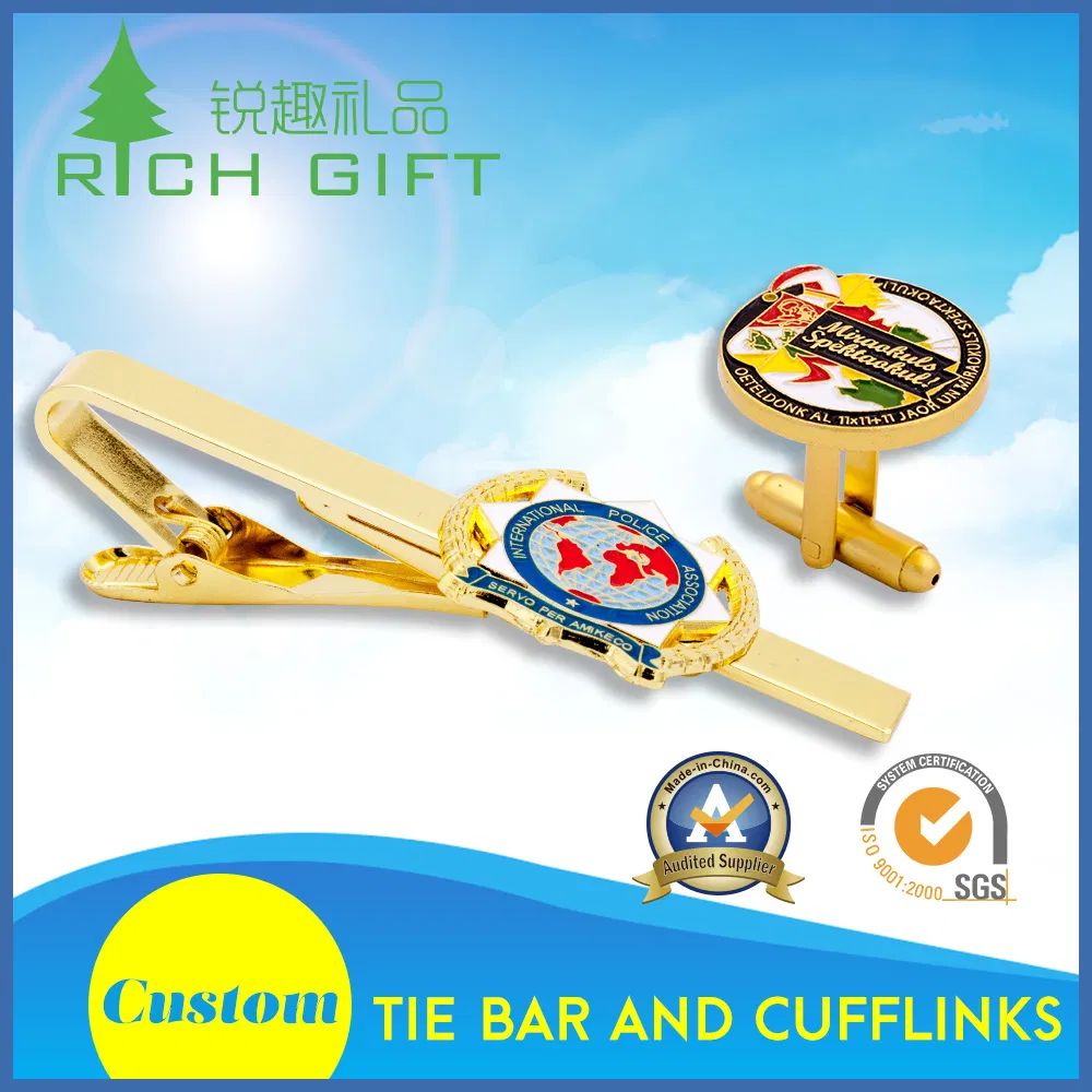 Men's High Quality Custom Metal Enamel Movement Polished Stainless Steel Novelty Gold Plated Set of Tie Clip Cufflinks with Gift Box