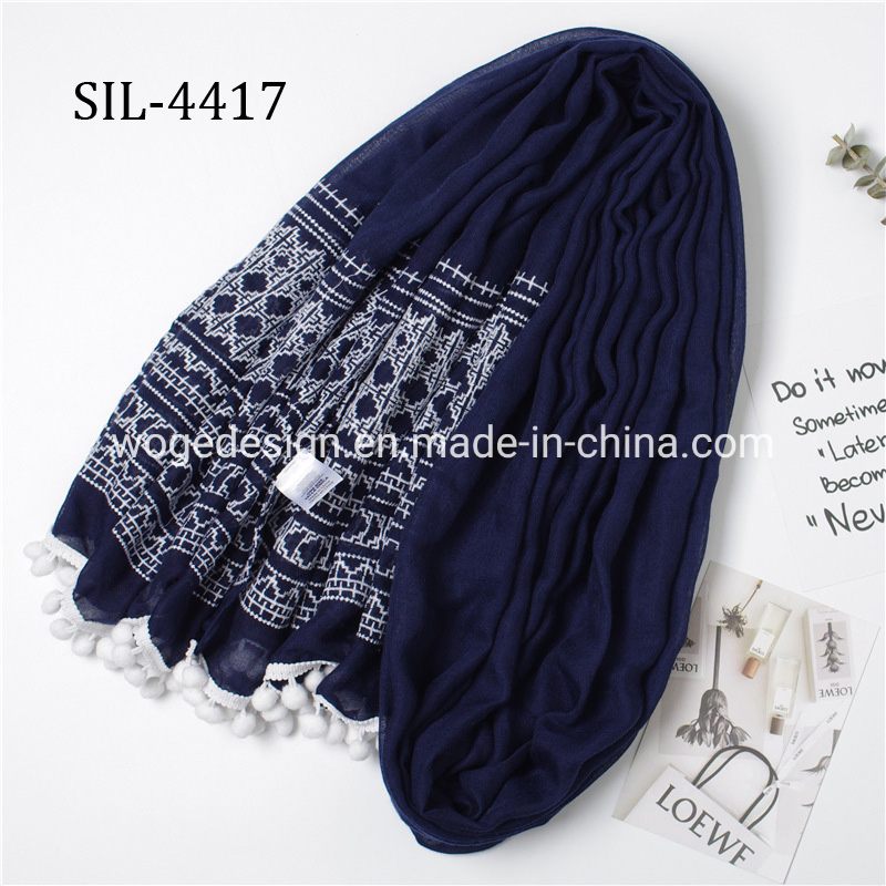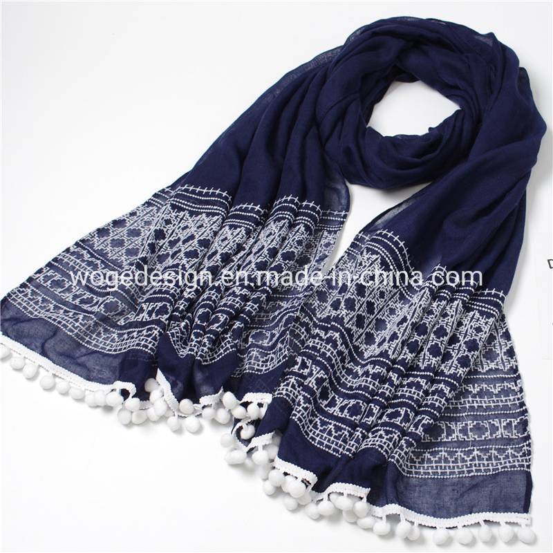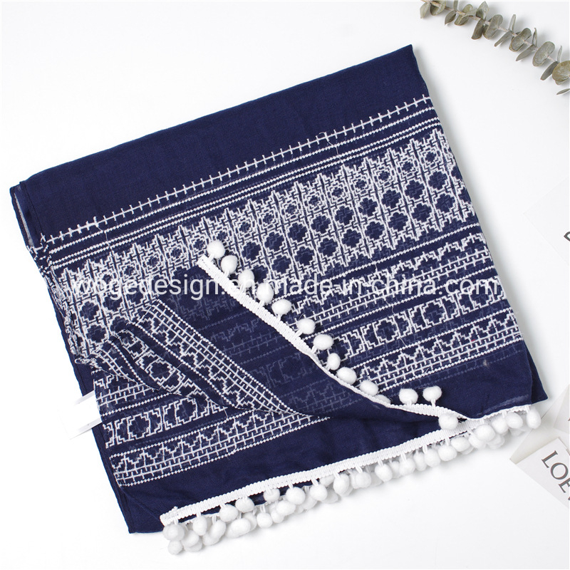 Fashion ethnic lady muslim dressing accessory pompom navy blue embroidery geometric pattern viscose scarf
