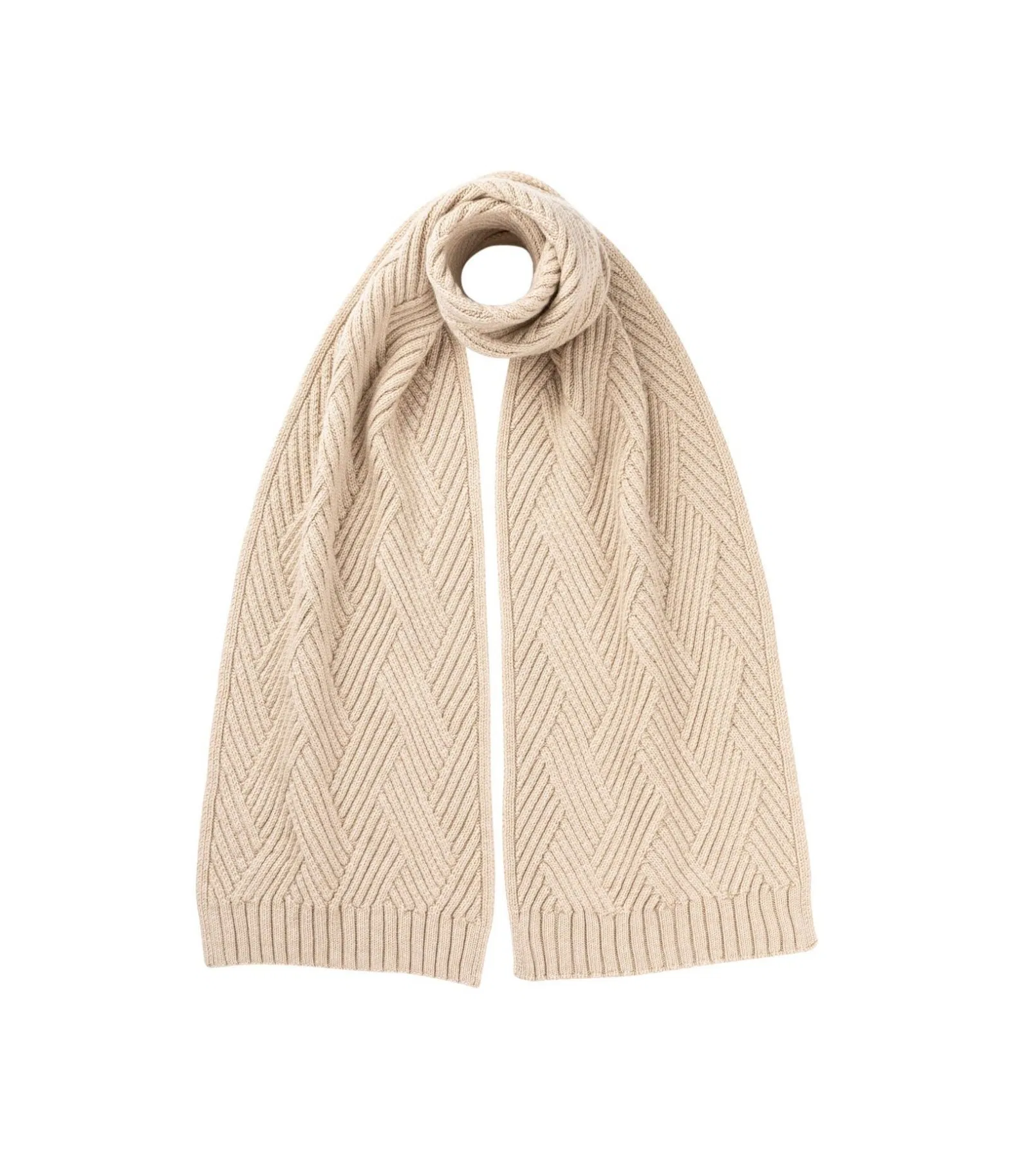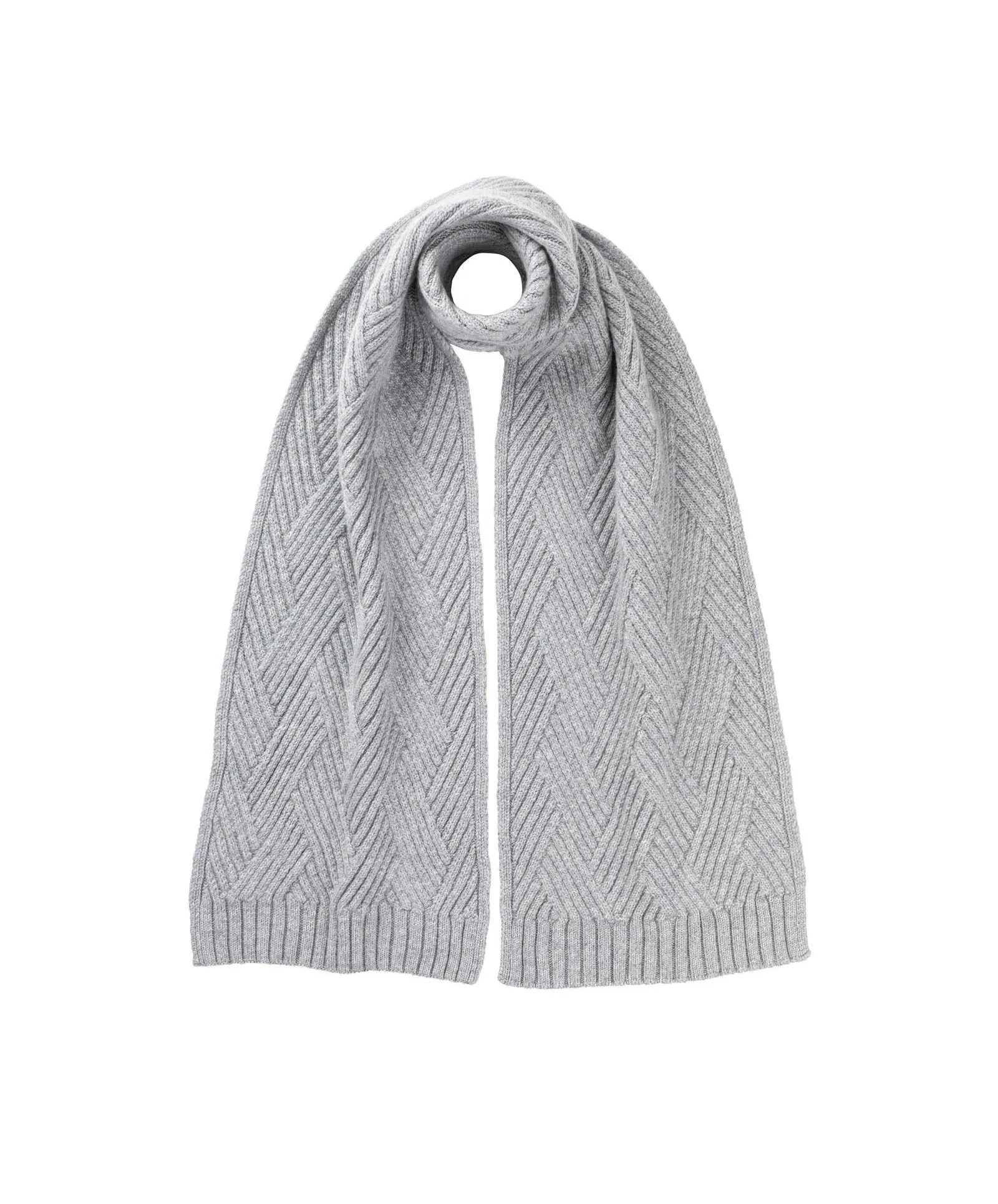 Geometric Rib Knit Silver Cashmere Scarf. Knitted with our finest Cashmere yarn we have created a beautifully detailed scarf inspired by geometric lattice designs. The lattice kit allows us to create a beautiful luxe accessory, which provides warmth without weight.
